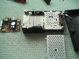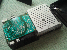 FILE0349.JPG 後は、ドライブのネジをはずすだけでレンズが見えてくるのですが、PS2の場合、ピックアップ調整ボリュームはレンズの下にあるので本体底部から分解していく必要があるようです。