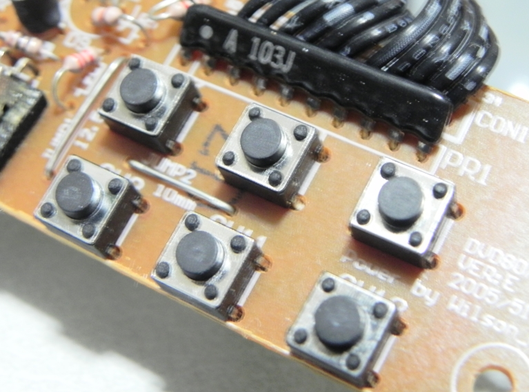 写真のようなボタンはプレーヤー、プリンター、ビデオデッキなど、さまざまな家電製品にあります。 主に操作スイッチとして本体に使用されています。 今回はこのような操作スイッチの修理に関する記事となります。 ※リモコンやコントローラーといった製品はスイッチではなくパッドが使用されている。 |