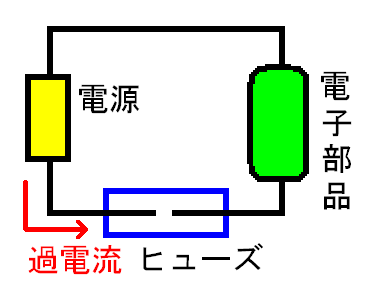 そのため、電源とメインの電子部品の間にヒューズを入れ、回路に過電流が流れてもヒューズで回路を切断し、電子部品に過電流が流れないようにします。 つまり、あえてヒューズを破壊することによって被害を最小限に抑えるのです。 |